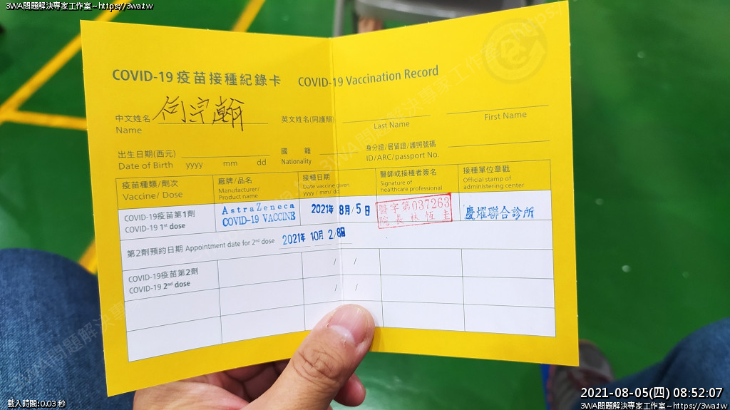 | 內容說明:2021.08.05打AZ疫苗 | 瀏覽人數: 1247 |