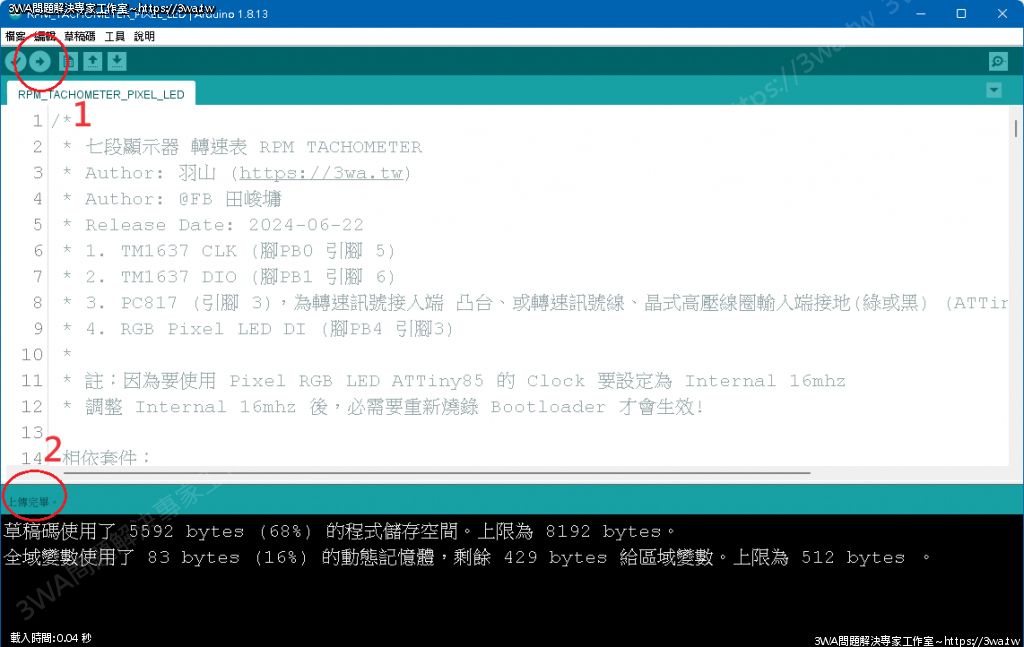 | 內容說明:2024.06.23 ATTiny85 WS2812B 機車轉速表 | 瀏覽人數: 726 |