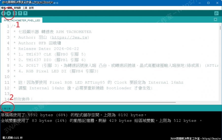 | 內容說明:2024.06.23 ATTiny85 WS2812B 機車轉速表 | 瀏覽人數: 725 |