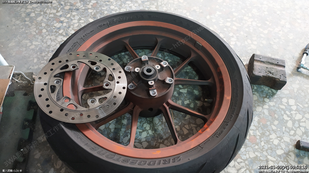 我整理卡鉗時,小黑拿輪胎去請車行用裝胎機安裝