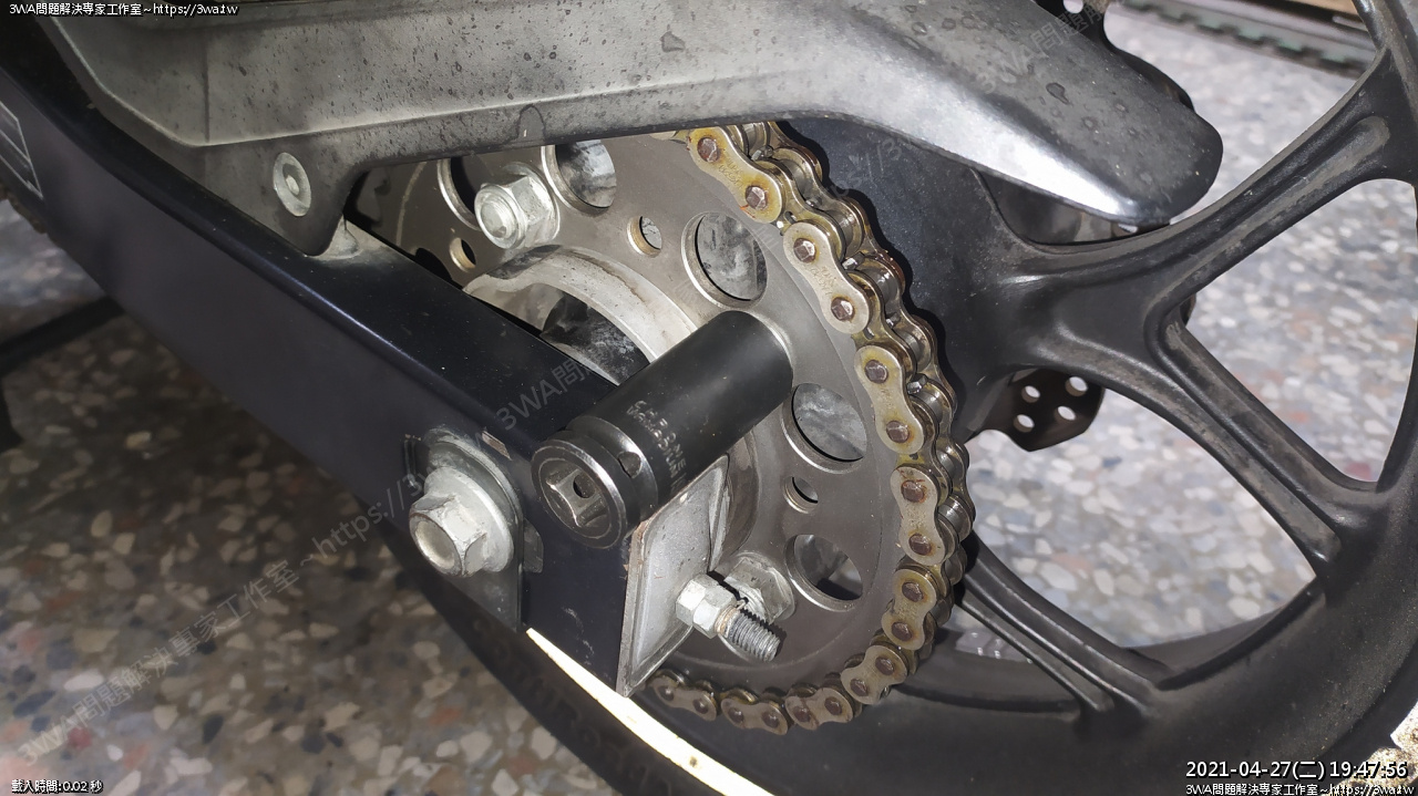 裝回中間的襯套,把後輪推回,底下墊個木塊,很輕鬆就把軸心插回