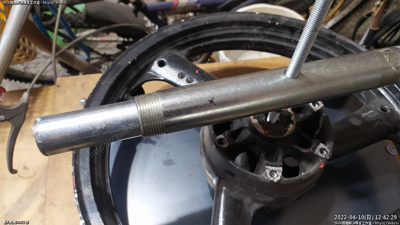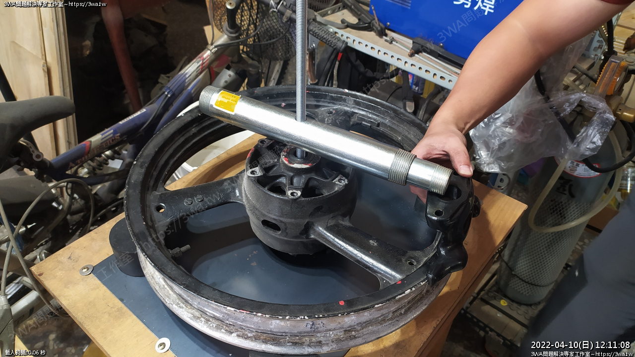 6、徒手裝胎輪框會跑,會浪費很多力氣,有自製拆胎機,不論壓胎,或是固定,都很好發力
