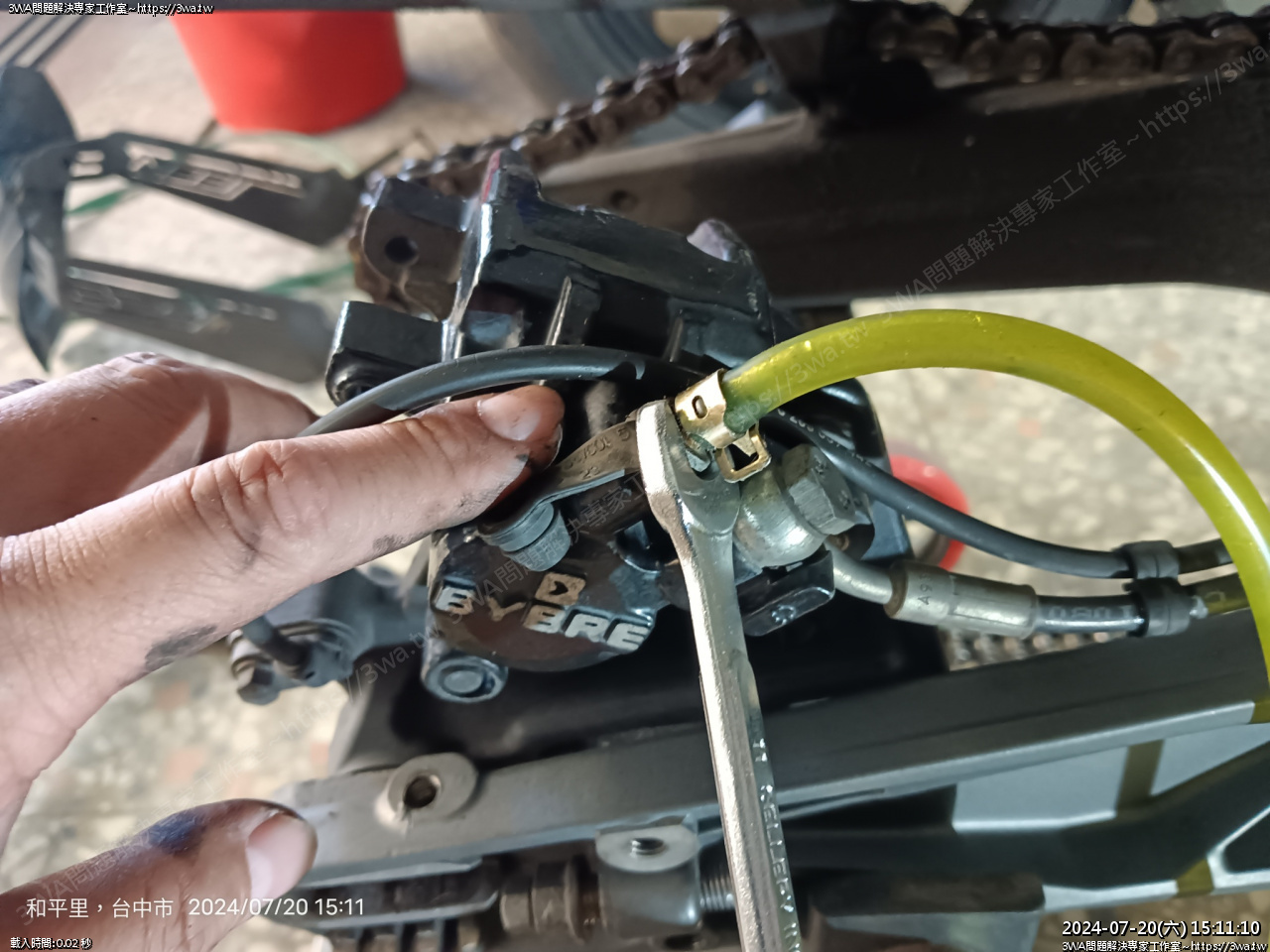 拆下卡鉗,為防止煞車油亂滴,下面盆子接好,油管用螺絲鎖住