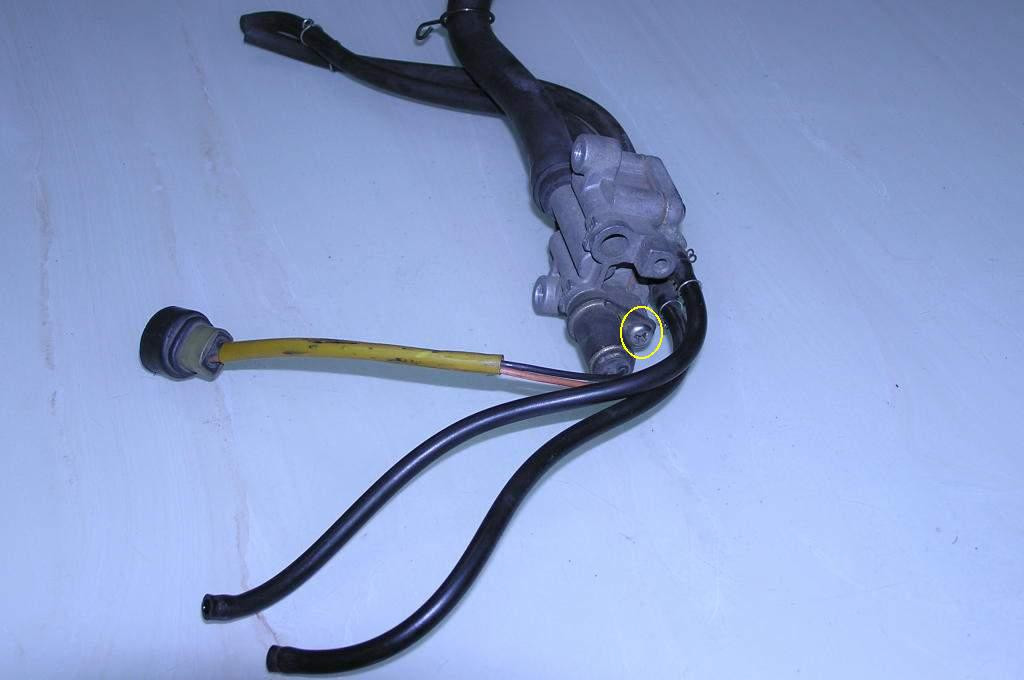 空氣補償器的後面照。照片即車上安裝時朝後的方向。有兩條較小口徑的小管連接化油器和空氣濾清器箱軟管接頭座外側後方的小接頭。黃色線路的就是電子閥拆下照片黃圈的小十字螺栓即可拔